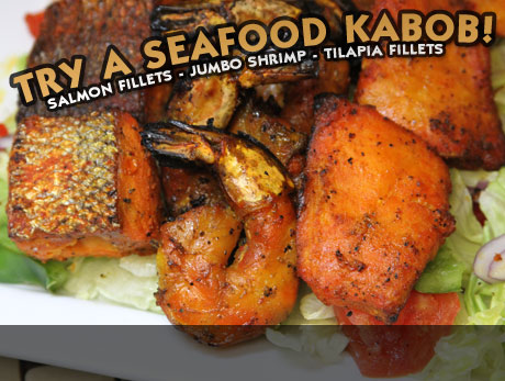 Seafood Kabobs We carry a variety of delicious seafood items including Salmon, Shrimp, Tilapia, and Tuna. Check out our Kabob Menu for more info.